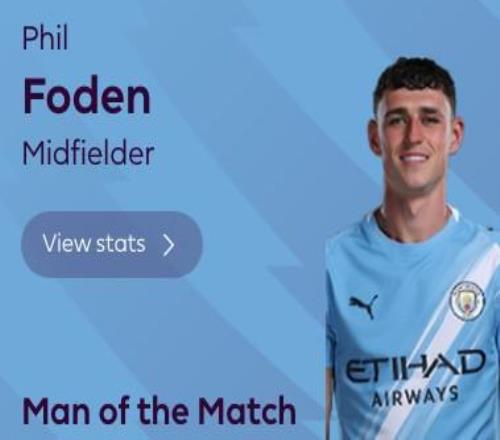 梅开二度,福登当选曼城vs利兹联全场最佳球员