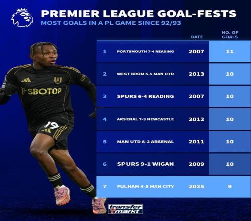 英超历史单场进球榜:富勒姆45曼城位列第七,最多为11球