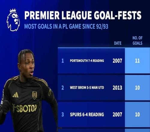 英超历史单场进球榜:富勒姆45曼城位列第七,最多为11球 -